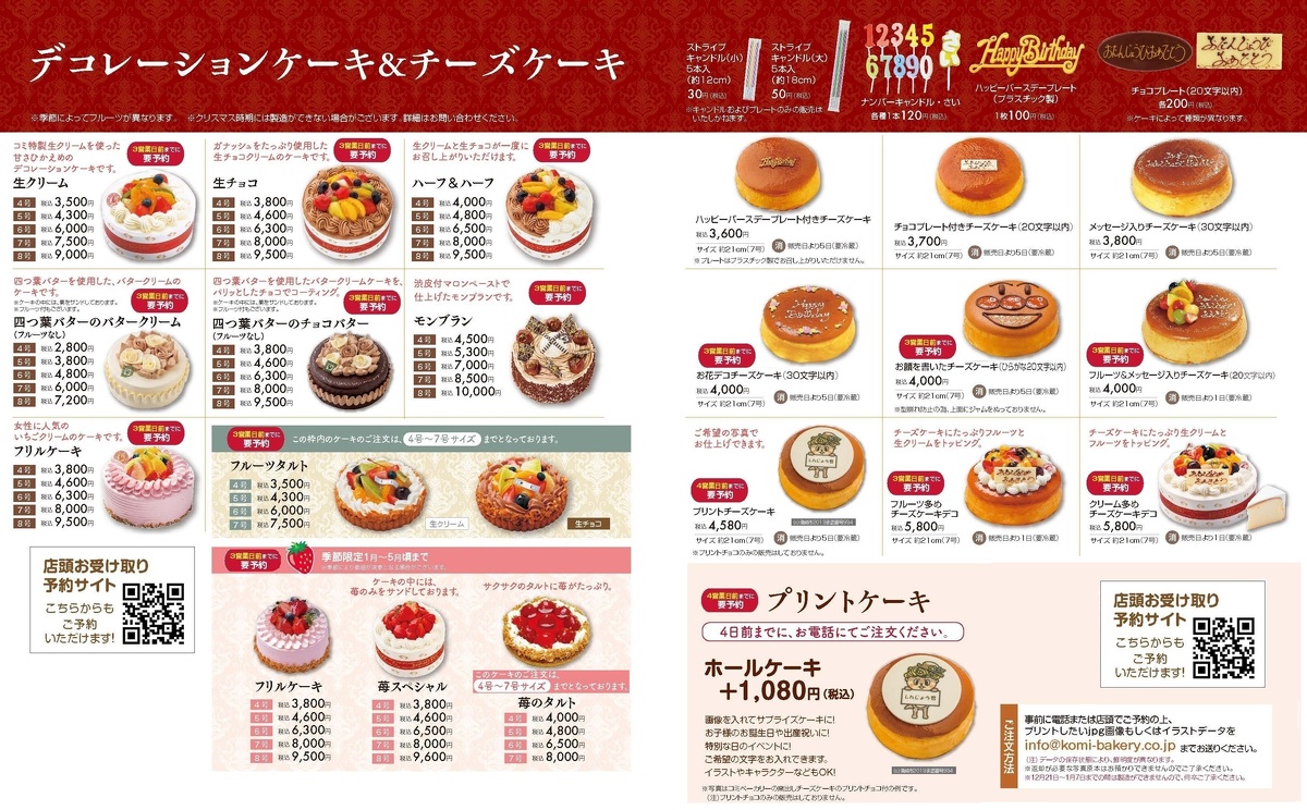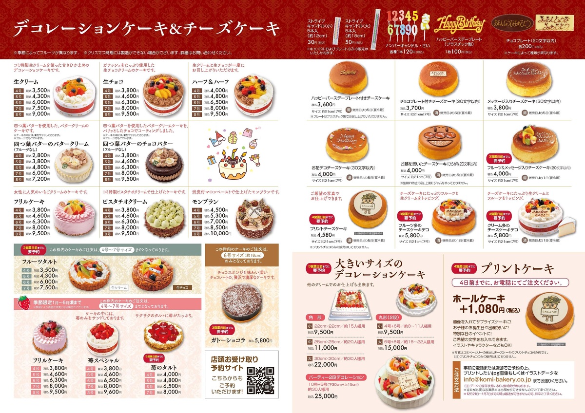 お誕生日ケーキに大人気のデコレーションケーキはこちらからお選びいただけます。尚、『コミベーカリーの窯出しチーズケーキ』もお誕生日仕様やイベント仕様でのご注文も可能でございます。(※写真をクリックしてご覧くださいませ。)